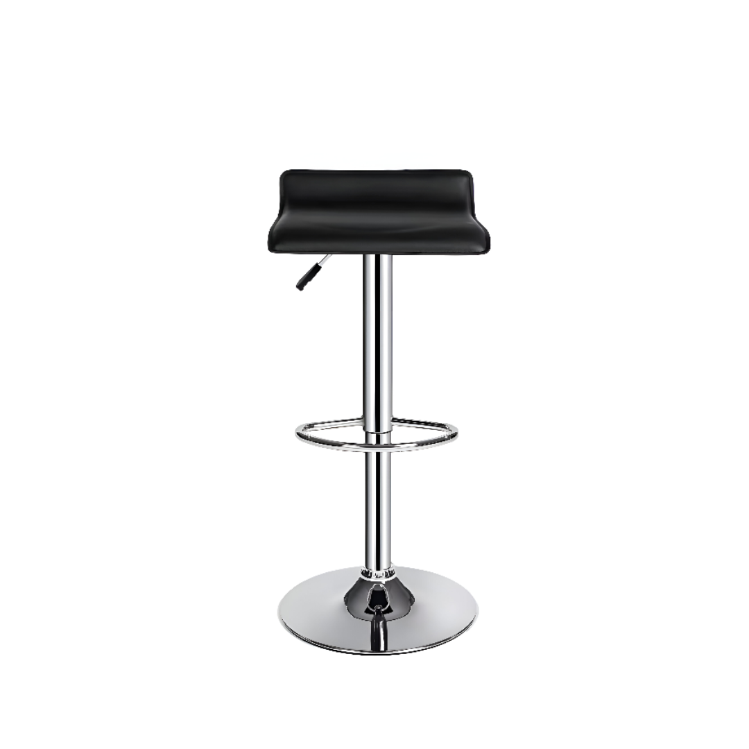 Su asiento acolchado en cuero sintético ofrece una experiencia ergonómica y cómoda incluso durante usos prolongados, mientras que su estructura metálica cromada con base circular y reposapiés integrado garantiza estabilidad, durabilidad y un diseño sofisticado.
